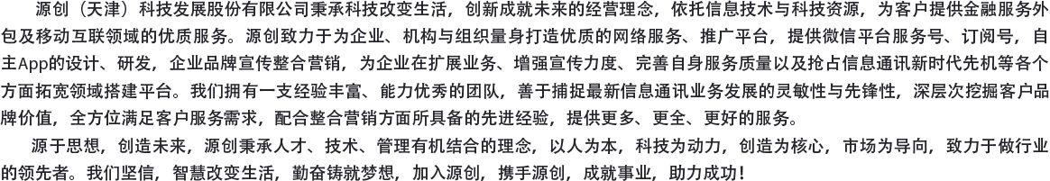 源创(天津)科技发展股份有限公司秉承科技改变生活,创新成就未来的经营理念,依托信息技术与科技资源,为客户提供金融服务外包及移动互联领域的优质服务。